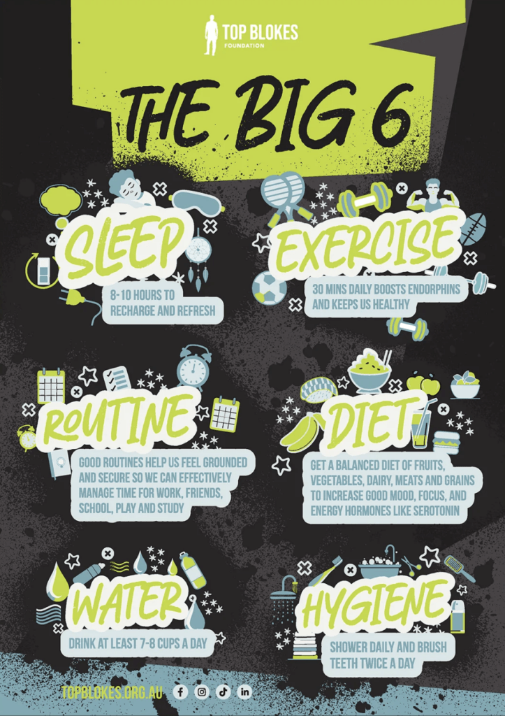 Top Blokes the ‘Big 6’ are six simple steps – water, routine, healthy food, exercise, sleep and hygiene – we can all take to build a strong foundation for positive mental health. Youth Worker Nick shares his tips on how to integrate the Big 6 into your every day life. Share the video on your socials or send it to a mate.